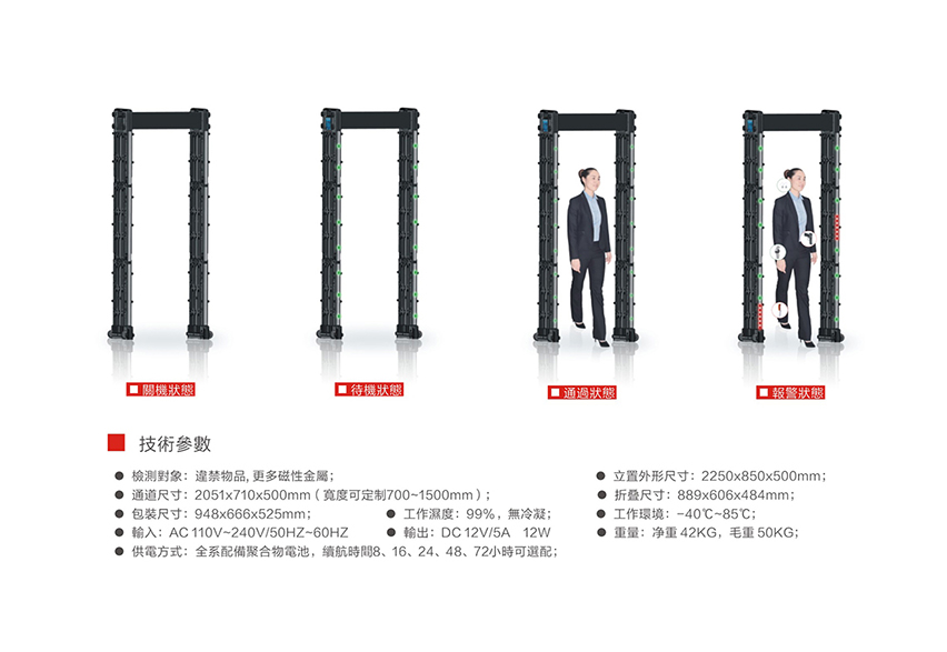 HC-TY800便攜式金屬探測門(折疊式)采用電子頻率芯片,內置高亮的區位led燈顯示,由abs、聚碳酸酯合金材料等抗沖擊力強材料制作而成,液晶顯示調節、靈敏度可調300個級別,內置雙電池左右各一個、電池可續航30小時以上,可選配續航80小時,由6塊傳感區域可以左右上下任意互換裝配,不分左右、不分上下、任意組裝、自動調節、。